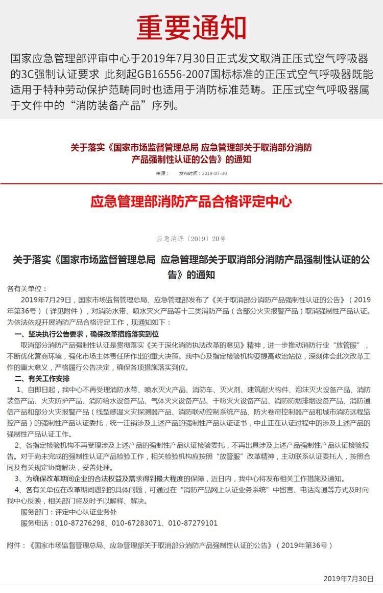 國家應急管理部評審中心于2019年7月30日正式發文取消正壓式空氣呼吸器等消防員裝備3C強制認證要求,此刻起GB16556-2007國標標準的正壓式空氣呼吸器既能適用于特種勞動防護用品范疇同時也適用于消防標準范疇。正壓式空氣呼吸器屬于文件中的CNCA-C18-04-2014“消防裝備產品”序列。