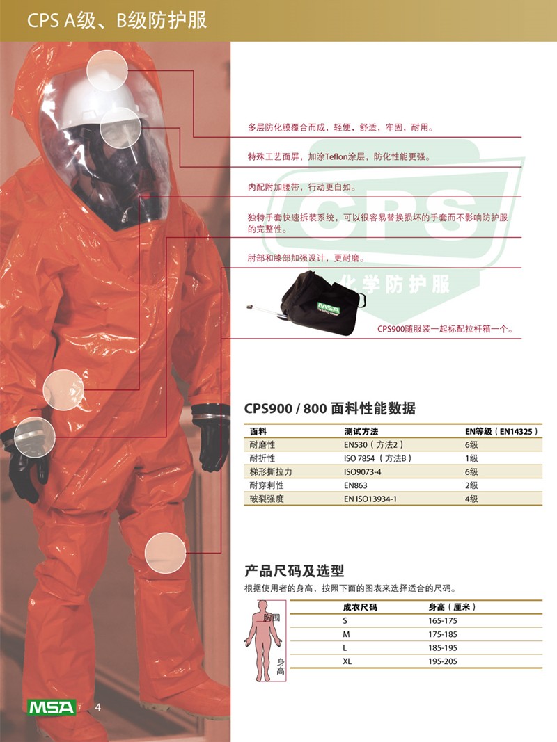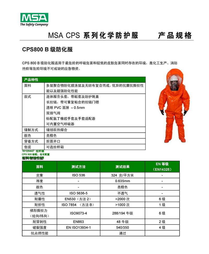 梅思安10124983CPS800防化服由多層特制的防化聚合物覆合而成,達到優佳的化學防護性能及優異物理面料性能,配合內置空氣呼吸器使用,可提供Level B(B級)防護。